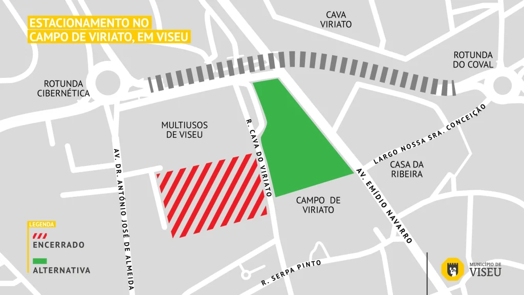 O Município de Viseu decidiu abrir, temporariamente, parte do Campo de Viriato para estacionamento automóvel, nomeadamente as zonas em frente ao Bairro da Restauração e ao espelho de água, com entrada pela Avenida Emídio Navarro.