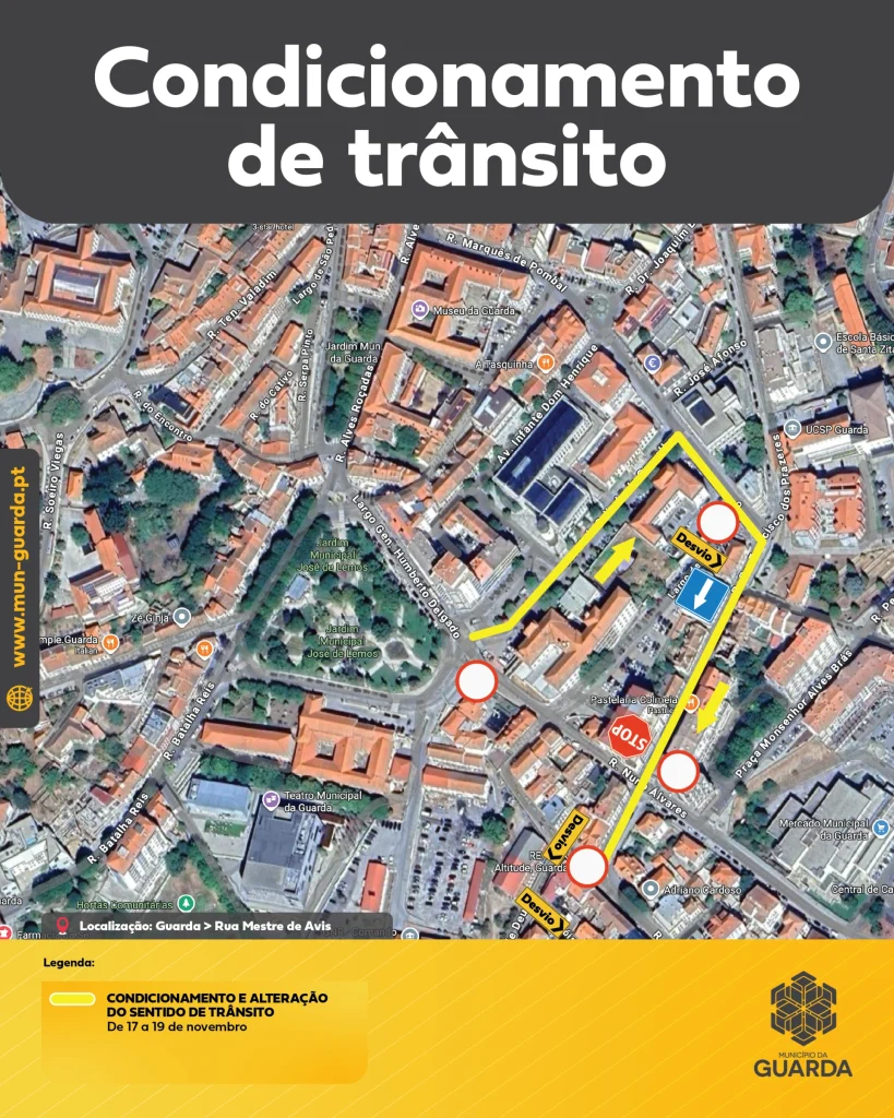 A Câmara Municipal da Guarda informou que, entre os dias 17 e 19 de novembro, várias vias da cidade irão sofrer condicionamentos de trânsito devido aos trabalhos de reparação do abatimento no pavimento da Rua Mestre de Avis. As intervenções, necessárias para garantir a segurança rodoviária, implicam alterações temporárias na circulação, sobretudo para veículos pesados, de acordo com nota de imprensa enviada à Central Press.