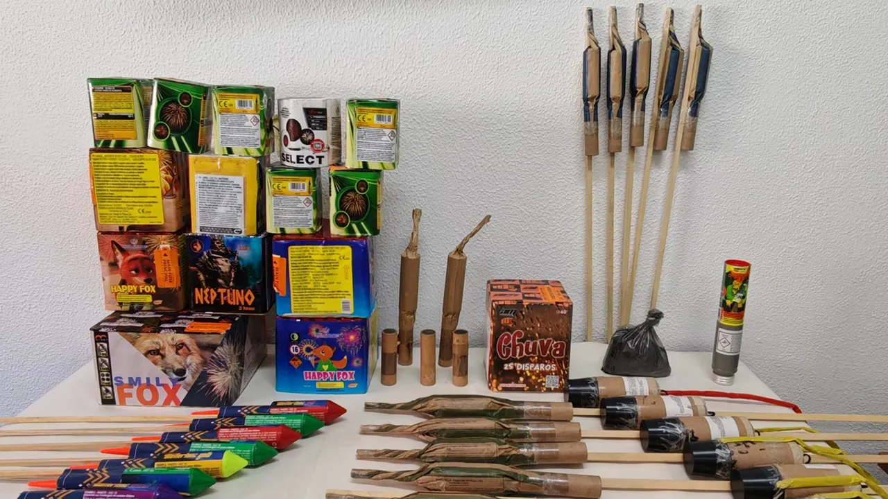 No âmbito de uma denúncia relativa à posse de diversos artigos pirotécnicos, os militares da Guarda desenvolveram diligências policiais que permitiram identificar o suspeito. No decorrer da ação, foi realizada uma busca domiciliária, resultando na detenção do suspeito e na apreensão do seguinte material: